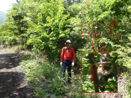 林道の脇に赤いテープがあるのを見つけました。 90%以上は大船山の登山ルートとは違うと思いましたが、 とりあえず、行ってみることにしました。 四角の写真はテープの拡大です。 |