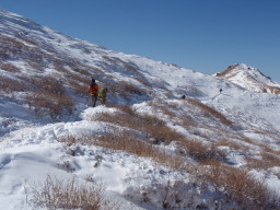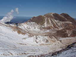 | 帰路です。噴煙をあげる硫黄山と三俣山です。 |
