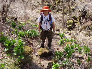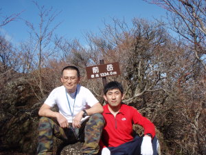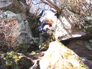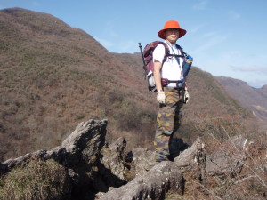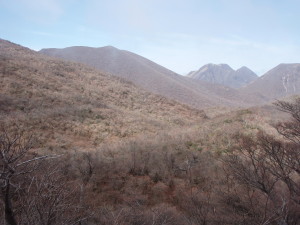 展望が開けた所で、大船山(左)、三俣山(中央)、平治岳(右)が見えます。