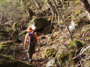 シャクナゲと原生林と苔のついた石の登りです。