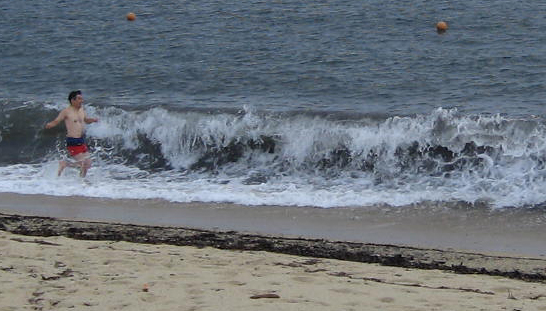 淀川登山口まで下山してタクシーを呼ぼうとしましたが、天候が悪いため、携帯電話が繋がりません。公衆電話がある場所まで、車道を2時間歩きました。 それでも、当初に計画していた下山時間よりもかなり早く下山出来ましたので、余った時間で海水浴に行きました。