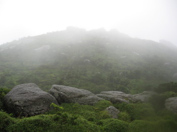 | 開けた所に着くとガスが濃くなってきました。 大雨が豪雨になり、強風で体温を奪われます。 |