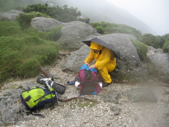 | これ以上進むのは無理だと判断し、ここでテント(本当は禁止)を張る事にしました。 ザックの中身が濡れないように傘を広げていますが、傘は強風で役に立ちません。 ここでテントを張って一夜を過ごす事がどれだけ危険がこの夜、身をもって体験しました。 このあと強風と豪雨でカメラに水が入りカメラが使えなくなります。 強風下でテントを張る時は、テントを張ると同時にテントの中に人がはいらないと、テントが吹き飛ばされてしまいます。(テントの中に軽い荷物だけだと荷物とテントも同時に強風でさらわれてしまいます。) |