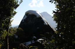 | 登山道の途中にある大岩と開聞岳の形を 合わせて撮影してみました。 両方とも上の部分には、雪が積もっています。 |