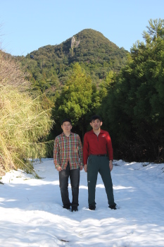 | 帰路で雪に覆われる農道の上で 西郷ドン岩をバックに記念撮影 無事下山 このあと、鬼門平(おんかどびら)に登る予定 でしたが、その山に行く林道に積雪があった ために断念 従って、さらに予定を変更して明日(1/3) 磯間嶽(いそまだけ)に登って、帰宅する 事に変更しました。 1/2の同窓会に参加できず御免なさい。 |