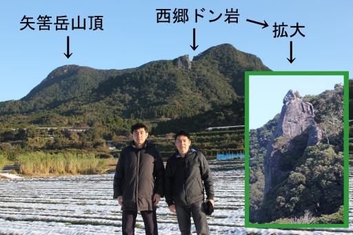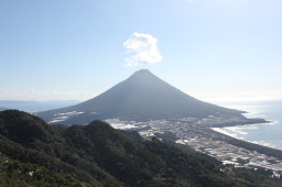 | この山の最大の魅力は、露岩から見える 眺望と西郷ドン岩などの巨石群でしょう。 この山の数多くの展望台から見える 展望はすばらしいの一言です。 この山から見える「開聞岳」です。 |