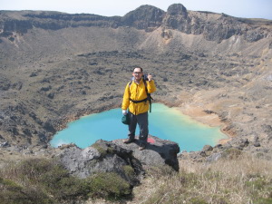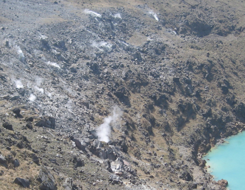 新燃岳火山湖の湖畔近くは水蒸気を噴出しています。2007年04月29日