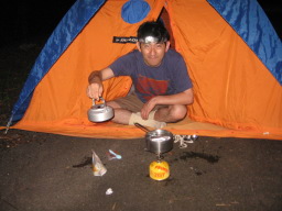 | 2007年07月22日(日) 起床と同時に朝食を作り始め、食事が出来る間にテントを片付けます。 |