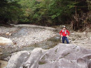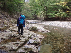 | 河原を歩きます。きれいな渓谷美です。 地図では右岸がルートになっています。 河原や谷は降る方向から見て右手を右、左手を左と言うように決められています。 ですから山に向かって登る場合は、左手の方が右岸となります。 |