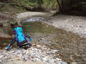 | ある程度足場が出来たら今度は石を運んで丈夫な足場を作ります。 渡河用の足場作りの製作時間約10分 帰路もこの道を通るので、帰りは楽でした。 後続の人にも役に立ったと思います。 |