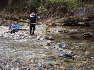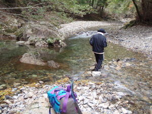 | 途中左側の河原が通行不能になっていました。 先人が川に石を投げ入れ、足場を作り川を渡った跡がありますが、これでは、濡れずに渡れないので、川にさらに石を投げ入れ足場を作ります。10:57 |