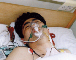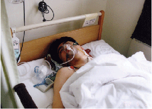| 手術後の高熱のため、氷のうで頭を冷やしています。 胃液が消化管の方に流れないように鼻からチューブを挿入し胃液を吸引し続けます。 痛み止めの麻酔薬を脊髄から点滴します。腕からは、抗生物質等の点滴をし、鼻から酸素吸入もします。この状態で、48〜72時間手術後の痛みが取れるまで待ちます。 寝返りも出来ません。非常に苦しい状態が続きました。こんな事はもういやです。 |