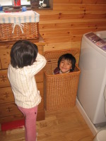 洗濯物入れに隠れる事が出来る事は子供ならではです。