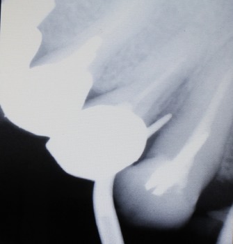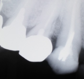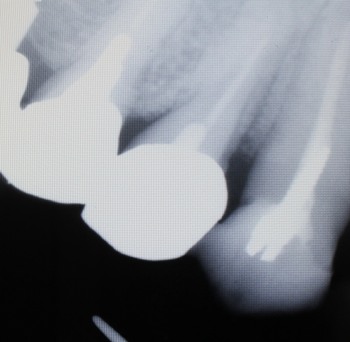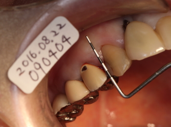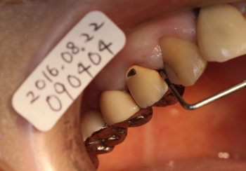 13番の無髄歯で歯根が変色した部分は歯ぐきと結合していない。