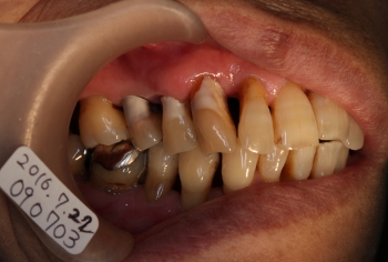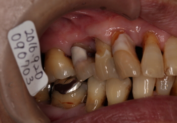 | 2016年09月20日 FOP(歯肉剥離掻爬術)の約2カ月後の状態。 同部を外科処置した翌日から痛みも、出血、排膿、腫脹、しみもなくなり予後良好。 ただし、歯間部分(14、15番間)の退縮が認められる。 |
