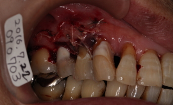 | 2016年07月22日 縫合、歯肉が薄かったので、縫合が困難。 糸がほとけないように縫合糸をデンタルシアノ(瞬接)で固定。 |