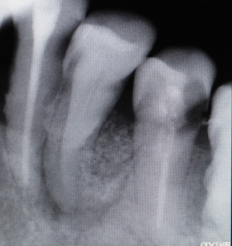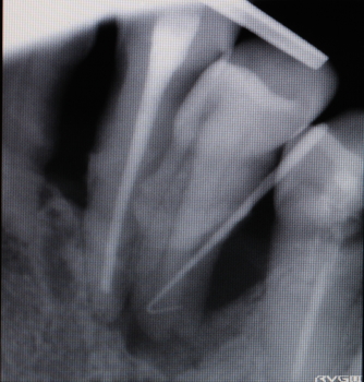 | 2016年07月22日 同部のX-ray 骨の吸収が著しい アクセサリポイントを歯肉溝から挿入すると 根先近くまで入る。 |