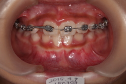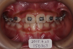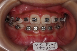 | 2015年05月27日 最初の主訴だった、前歯(切歯)の歯並びがほぼ改善されました。 下顎の犬歯の生える空間(スペース)がないので、下顎も矯正する事になりました。ワイヤー装着。 |