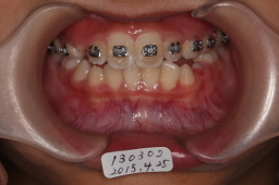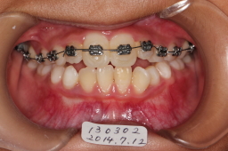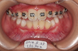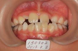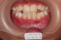 反対咬合は改善しているが、上顎切歯がはえる空間がないので、上顎歯列の拡大が必要。