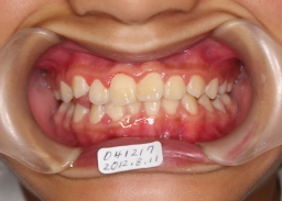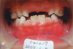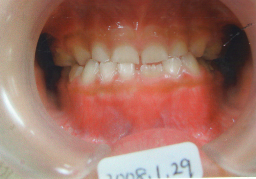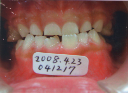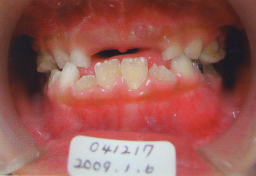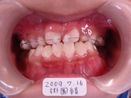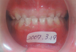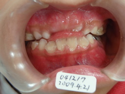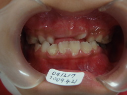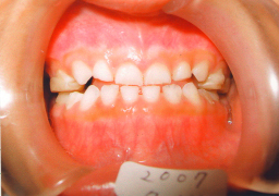 | 2009年04月17日(7才2ヶ月) 21番(左上切歯)がはえてきました。 反対咬合 第一大臼歯がまだはえてこない。 (固定源がない) |