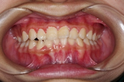 | 上顎切歯の被害が改善(反対咬合が治った)状態で、ワイヤーをはずす。 ↓その約2年5ヶ月後 |