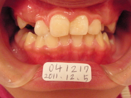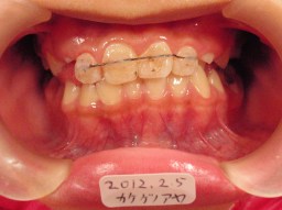 | 2011年12月17日(9才10ヶ月) 右側切歯(12番)が反対咬合 側切歯(12番)の反対咬合を改善するため、 12番が前方移動するようにワイヤーに 力を加えて接着剤でセット |