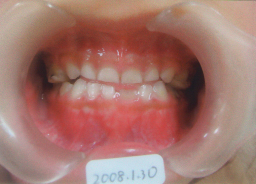 | 2009年04月17日(7才2ヶ月) 第一大臼歯がまだはえてこない。 (固定源がない) 上顎乳臼歯(DE)にレジンを添加して咬合挙上 |