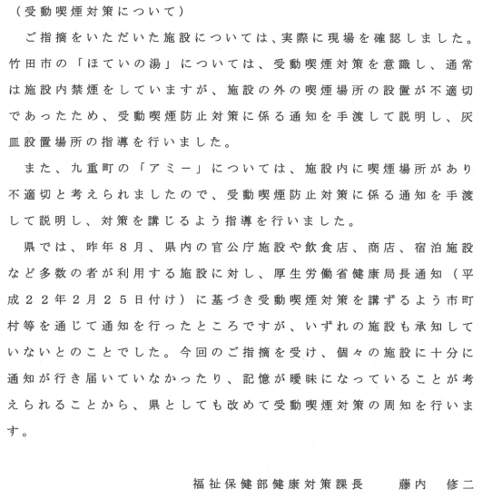 2011年09月23日に大分県内の施設を利用した所、受動喫煙の被害を受けたので、