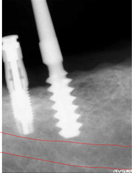 最初に1.5mmのドリルで試し掘りした時の距離を変えずに2本目のインプラント終了。 骨に深さがなかったので、下歯槽管の真上まで植立。ドリルが1回転(360度)で1mm進むので、ドリルを180度回せば0.5mm、90度で0.25mmの精度で合わせる事が出来ます。
