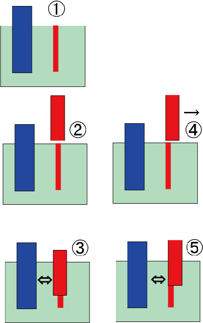スライド掘削方法は、ドリルを真下と真横(手前に引っ張る力)の2方向の力を加えて穴を掘っていきます。すると、穴が大きくなっても隣とのインプラントの距離が変わりません。 下記イラスト参照。 ABの掘削方法なら、隣との距離が短くなります。 CDなら隣との距離が変わりません。 |