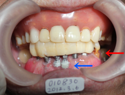 歯ぐきが退縮して自分の歯根やインプラント が露出していますが、インプラントに感染はなし。 =タバコは自分の歯やインプラントもダメにします= |