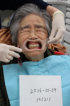 | インプラント植立後4年10カ月後 高齢のため最終補綴を入れずにTEK(仮歯)のままです。 仮歯で状態がよければ2〜10年は持ちます。 壊れた時に最終補物を入れるか再度TEKを作ります。 2016年01月09日撮影(96才) どんなにプラークがついてもインプラント周囲炎は起こりません。 |