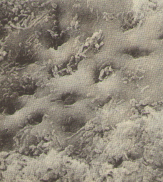 下記は天然の歯の表面の顕微鏡写真です。 歯の表面は、つるつるしているしているように 見えますが表面にミクロの凹があり、 その凹に細菌が約5個程はいる穴があります。 |
