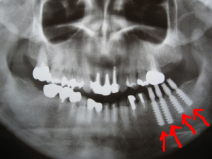 レントゲンで問題がない事を確認してからインプラントした所でご飯が食べれるよう仮の歯(プラスチック)の歯を作ります。 無事終了。 インプラント 1本7万円(税別)2010年年06月現在 |