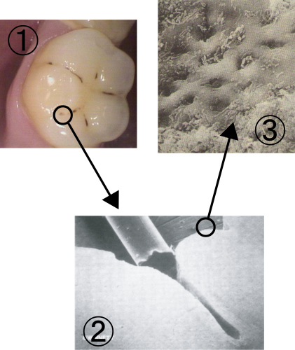 | @:歯の噛む面には、直径0.02ミリ程度の溝があります。 従って、その溝の中を歯ブラシで磨く事は不可能です。 |
