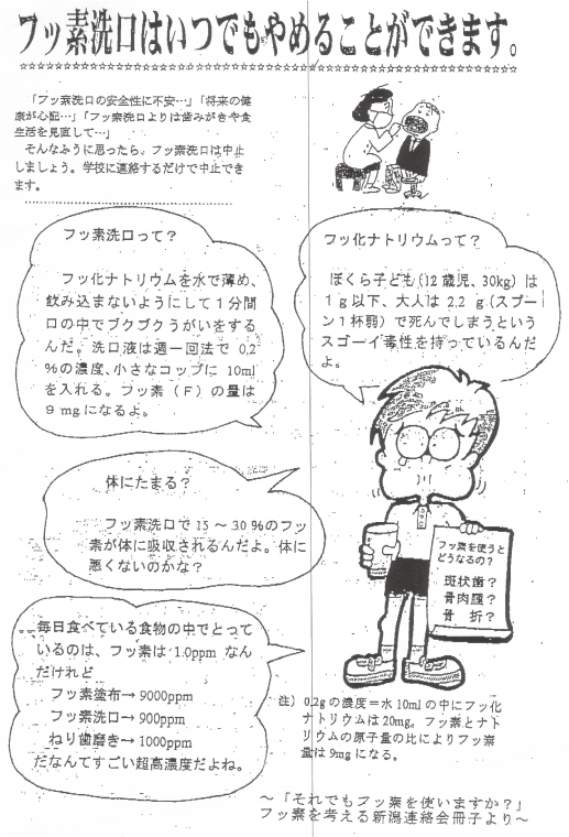 佐賀県鳥栖市の市議議員:田中ようこ氏が「フッ素洗口は危ない」というビラを配布して非常に困っているという苦情が私の所にありましたので、ここに公開します。(田中氏に対しては、電話や鳥栖市議会を通じて回答するよう連絡していますが、未だに(2019年06月15日)回答がないので、ここに公開します。納得いく回答があれば、このHPは消去します。)