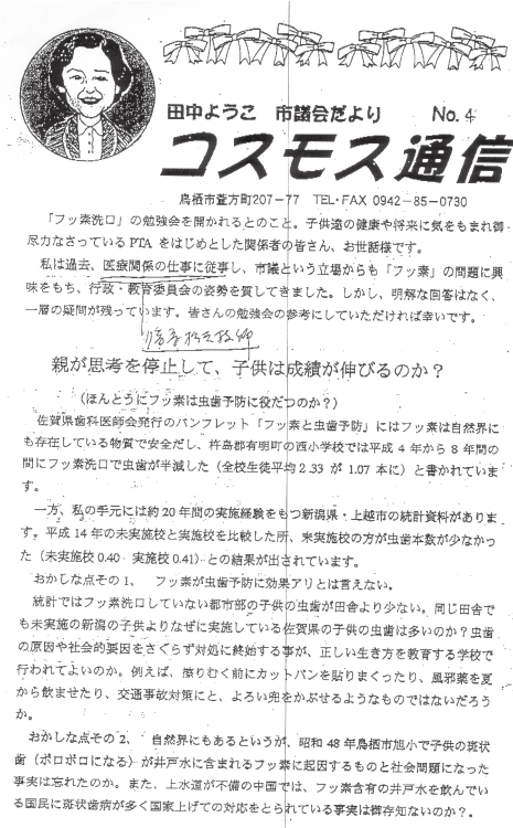 佐賀県鳥栖市の市議議員:田中ようこ氏が「フッ素洗口は危ない」というビラを配布して非常に困っているという苦情が私の所にありましたので、ここに公開します。(田中氏に対しては、電話や鳥栖市議会を通じて回答するよう連絡していますが、未だに(2010年11月20日現在)回答がないので、ここに公開します。納得いく回答があれば、このHPは消去します。)