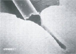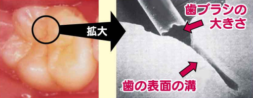 歯の溝を顕微鏡で見てみると、歯ブラシの1本の毛先より、細いのがわかります。
