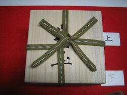 木箱用紐には、幅が3分(約9ミリ)や、4分(約12ミリ)などがあり、抹茶碗用木箱に取り付ける場合、1本の紐の長さは約1m50cmが必要になります。