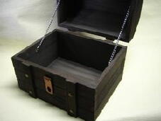 海賊宝箱は、1つ1つ手作りで製作しています。外部は板に甲乙の立体感を出す為に、全体をバーナーで焼き擦りあげるといった細かな作業を行っています。